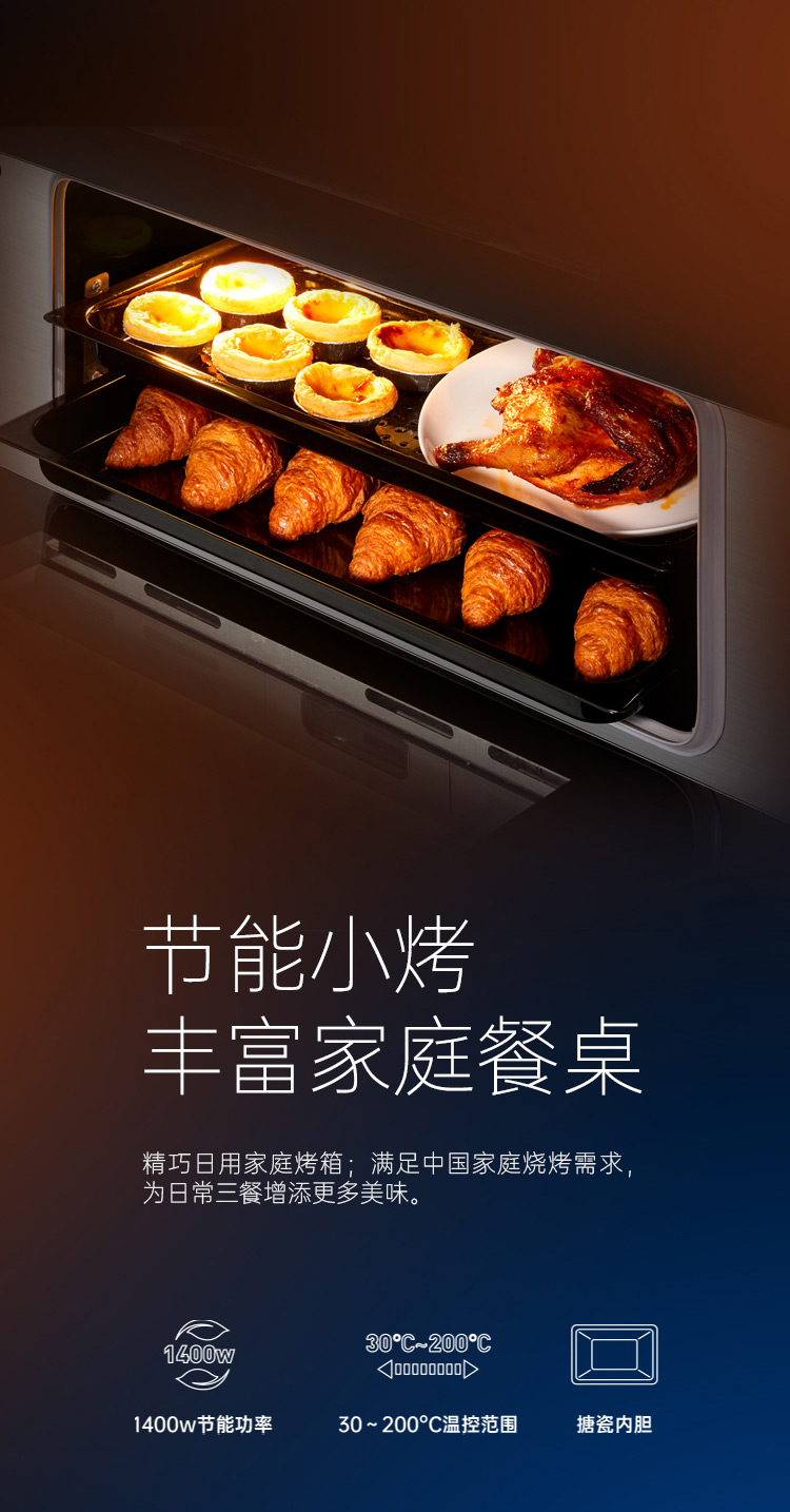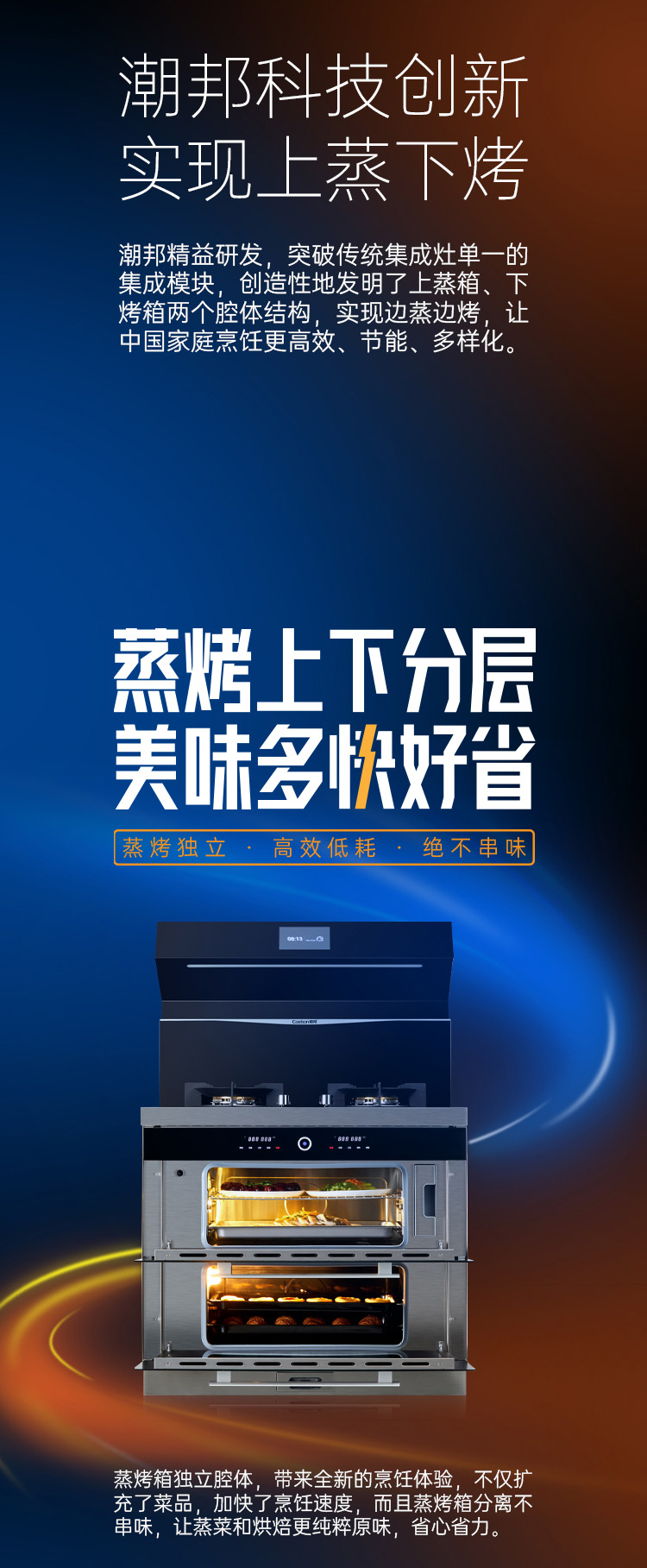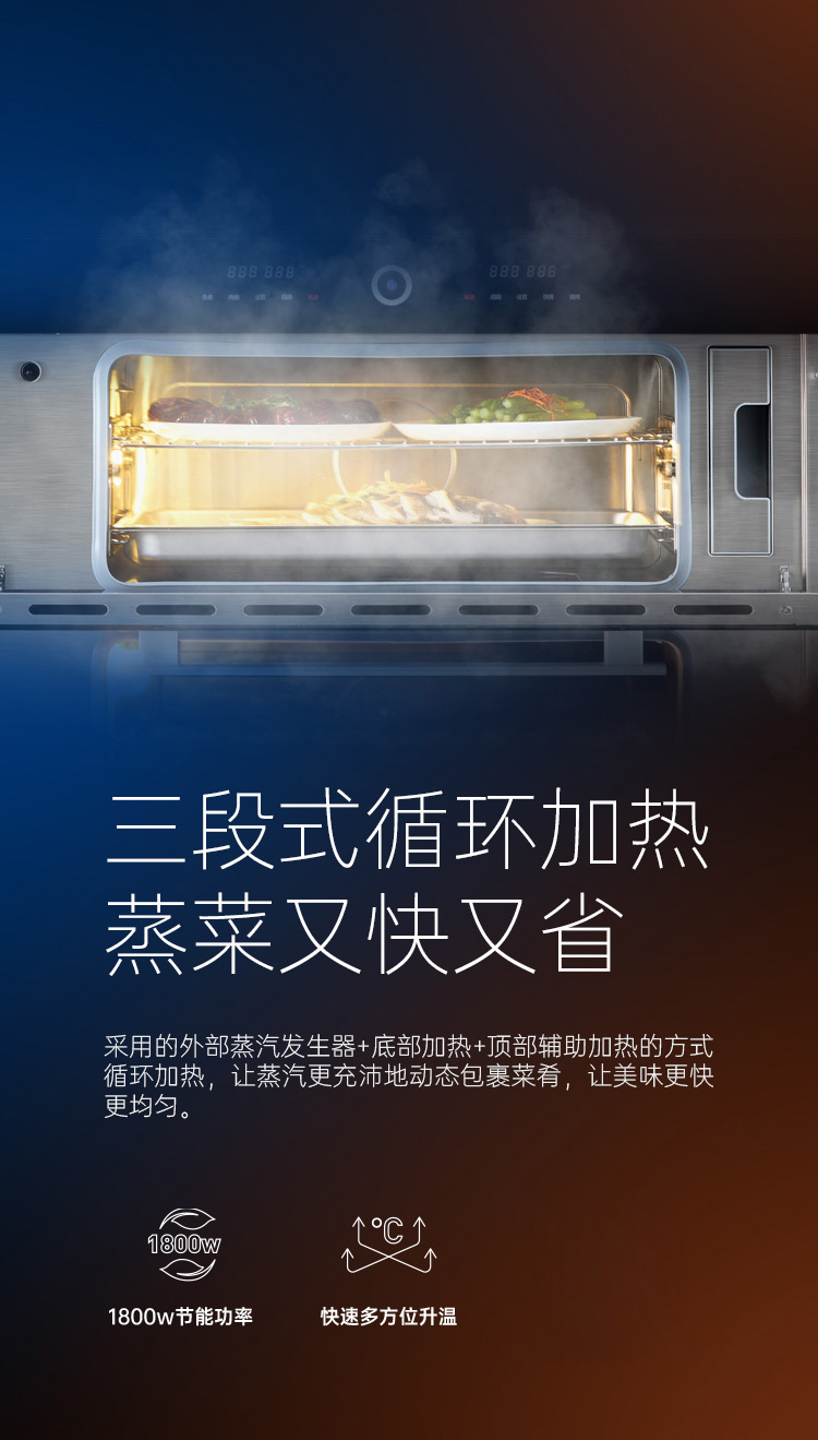 上蒸箱、下烤箱,实现边蒸边烤。更高效,更节能。